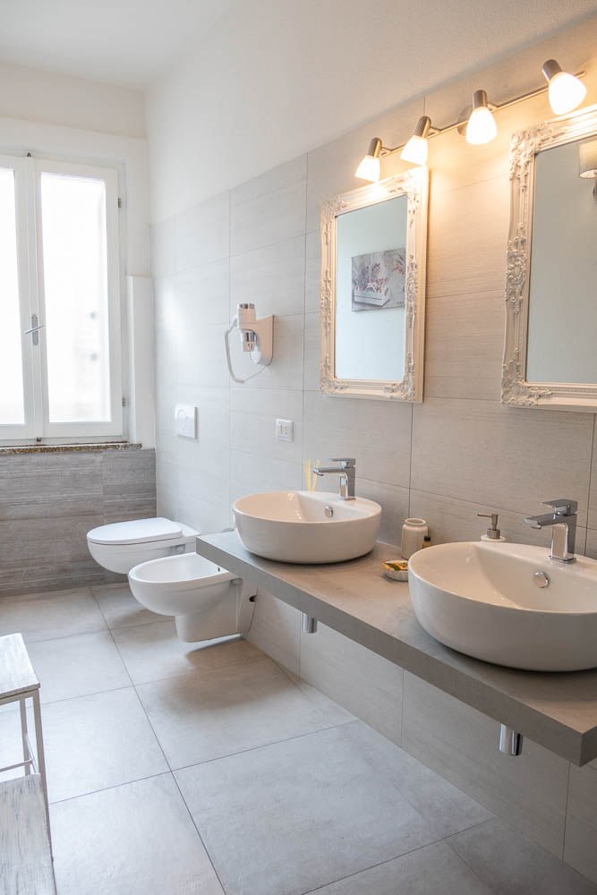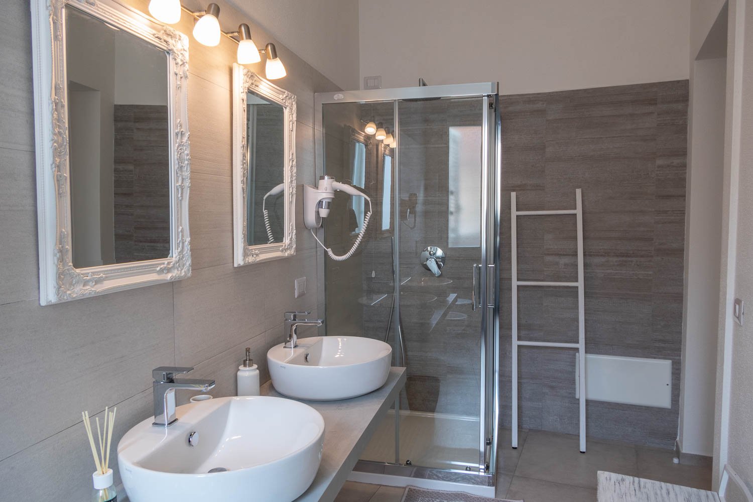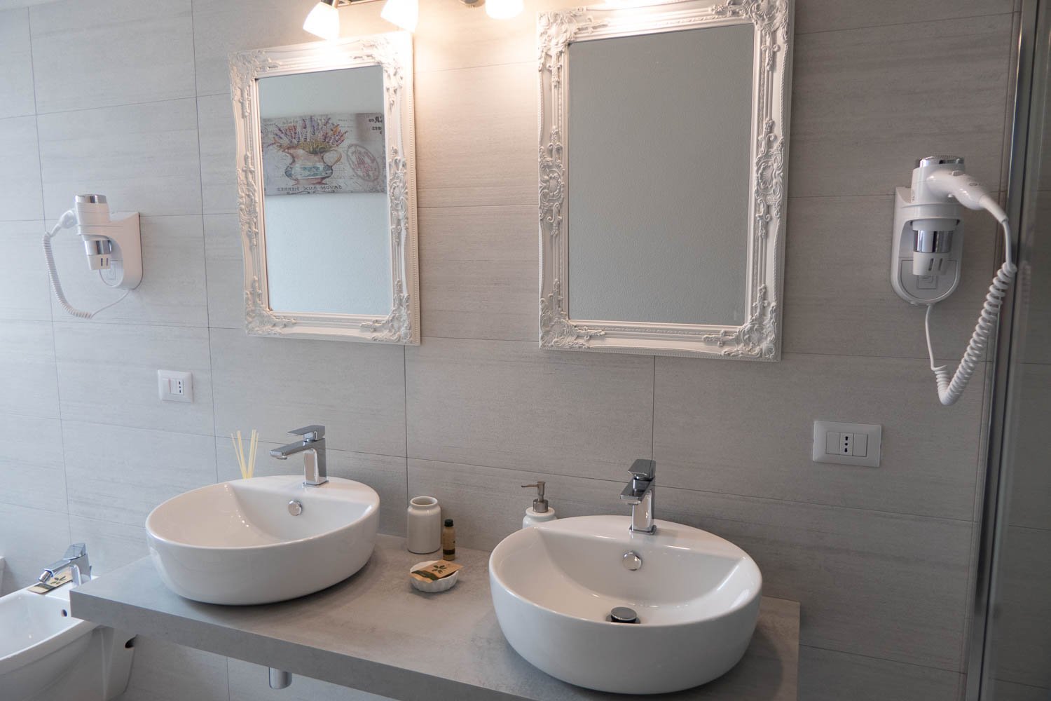 Il bagno in camera è spazioso, con ampia e comoda doccia, asciugacapelli, 2 lavandini e bidet.