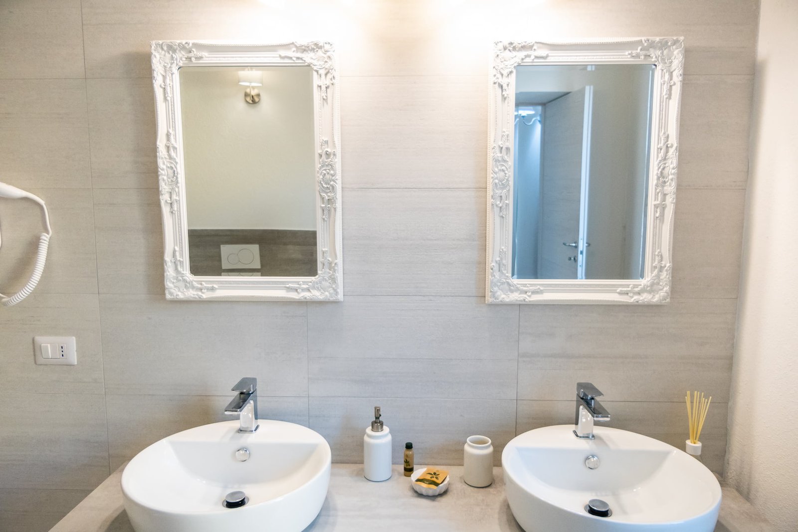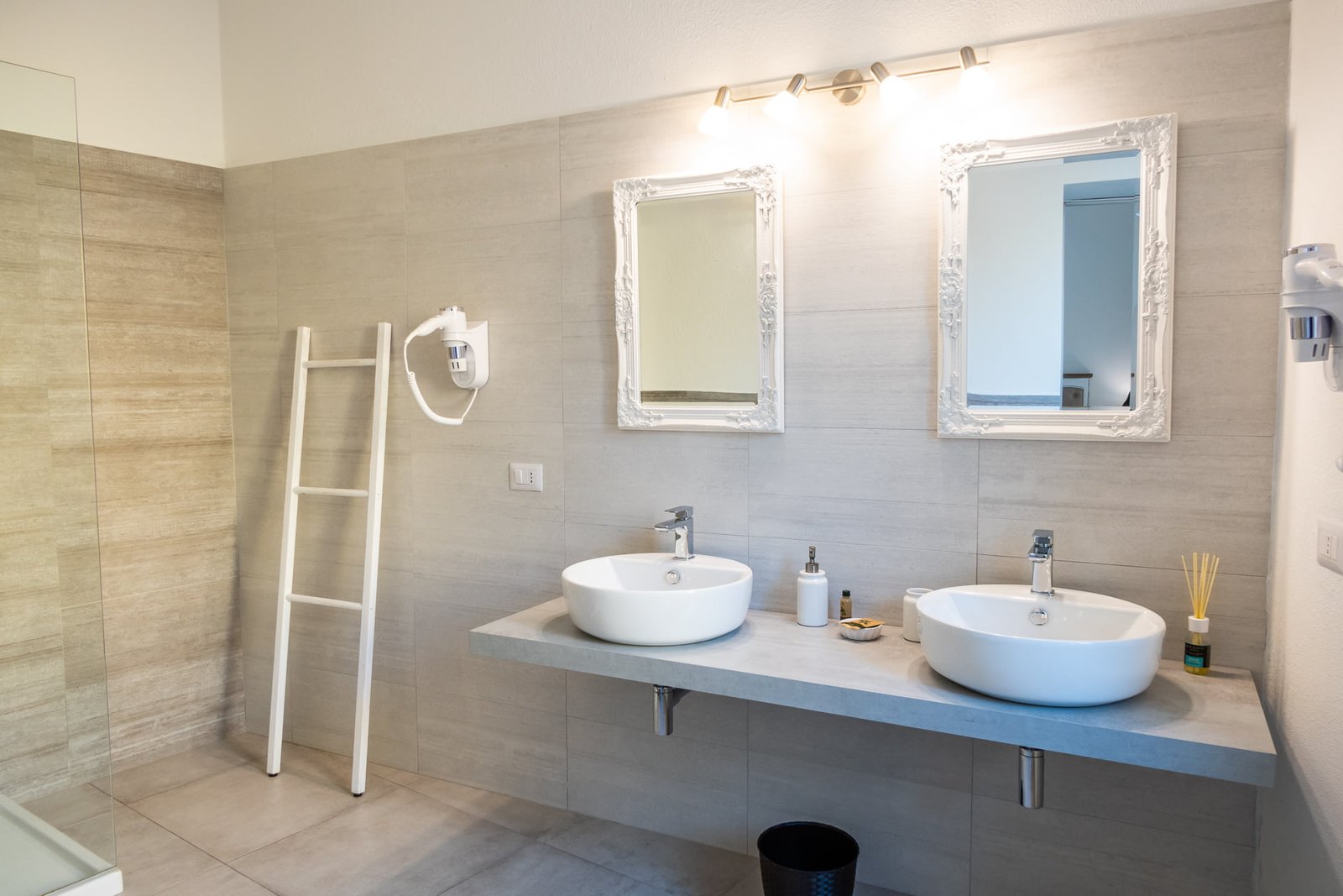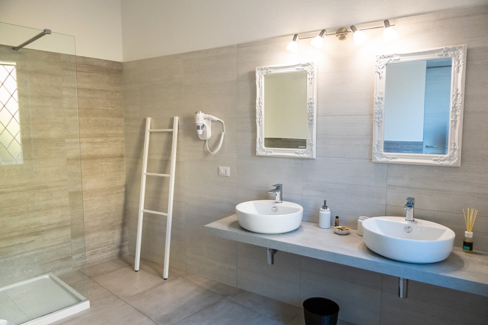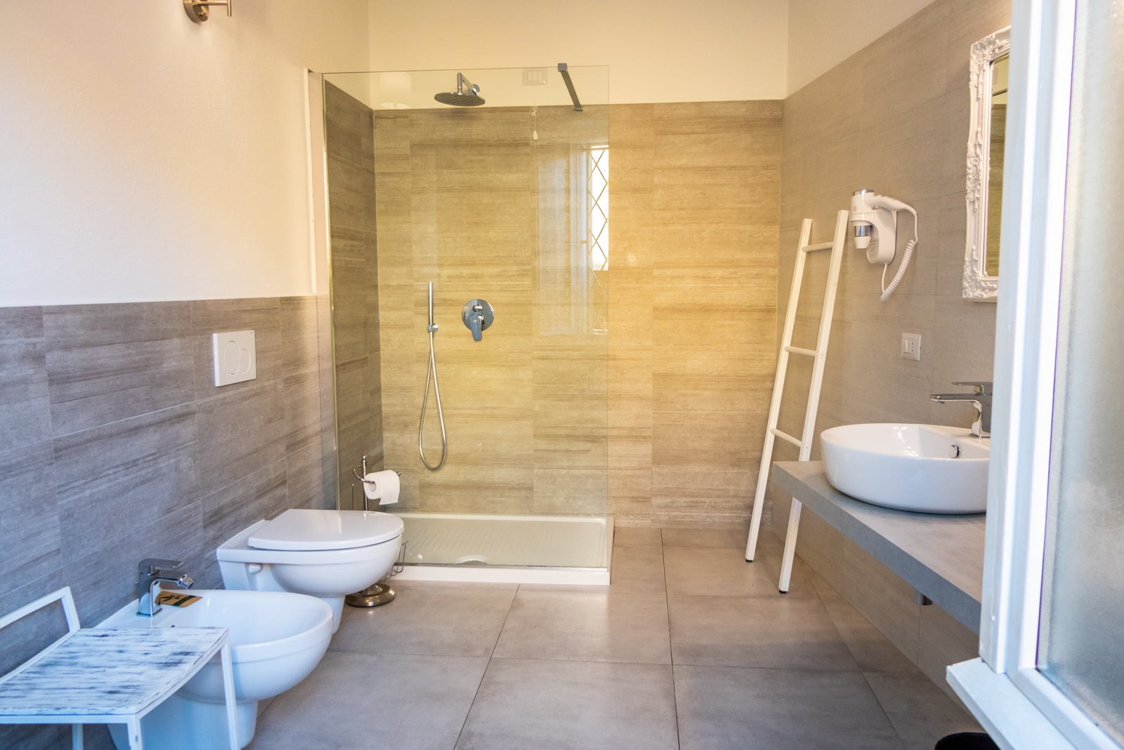 Il bagno in camera è spazioso, con ampia e comoda doccia, asciugacapelli, 2 lavandini e bidet.
